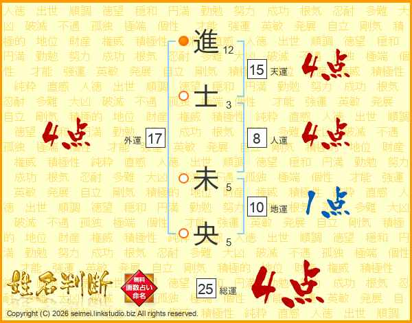 生活面を象徴する運勢です。外部から受ける影響力を表し、結婚運、家庭運や職場、環境への順応性を表します。総運から人運を引いた画数。姓や名が1文字の場合を除く。