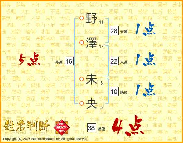 生活面を象徴する運勢です。外部から受ける影響力を表し、結婚運、家庭運や職場、環境への順応性を表します。総運から人運を引いた画数。姓や名が1文字の場合を除く。