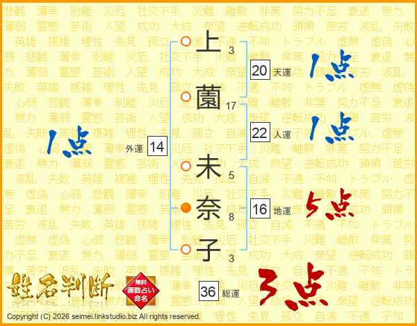 上(3画)薗(17画) 未(5画)奈(8画)子(3画)