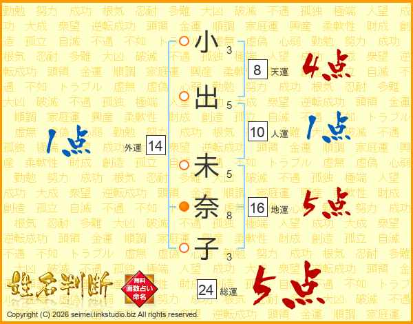 小(3画)出(5画) 未(5画)奈(8画)子(3画)