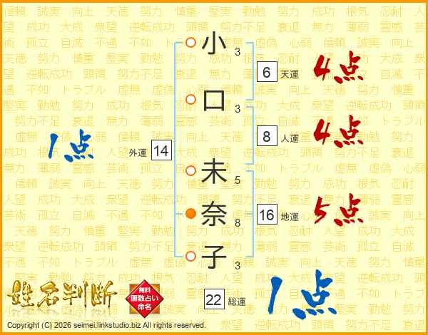 小(3画)口(3画) 未(5画)奈(8画)子(3画)