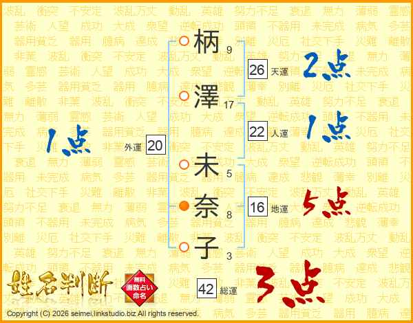 柄澤未奈子さんの天運は26画の2点!