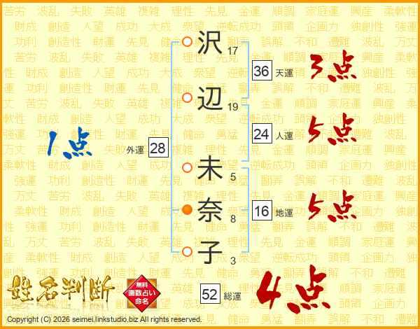 沢(17画)辺(19画) 未(5画)奈(8画)子(3画)
