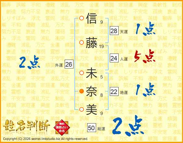 信(9画)藤(19画) 未(5画)奈(8画)美(9画)
