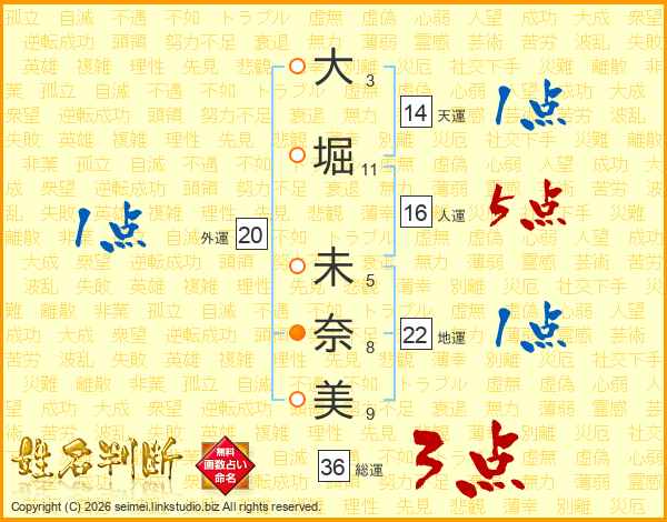 大(3画)堀(11画) 未(5画)奈(8画)美(9画)