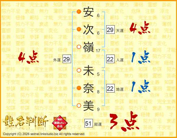 安(6画)次(6画)嶺(17画) 未(5画)奈(8画)美(9画)