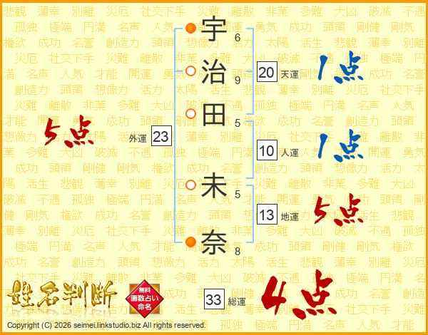 宇(6画)治(9画)田(5画) 未(5画)奈(8画)