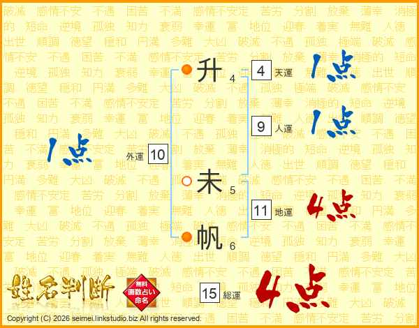 生活面を象徴する運勢です。外部から受ける影響力を表し、結婚運、家庭運や職場、環境への順応性を表します。総運から人運を引いた画数。姓や名が1文字の場合を除く。