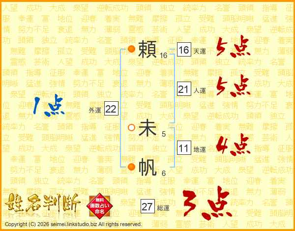 頼(16画) 未(5画)帆(6画)
