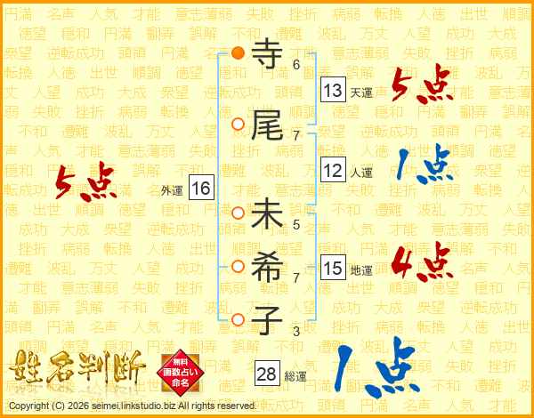 寺(6画)尾(7画) 未(5画)希(7画)子(3画)