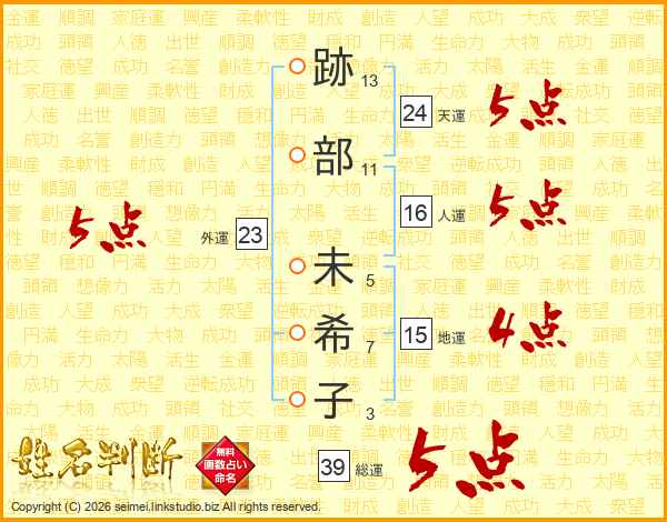 跡(13画)部(11画) 未(5画)希(7画)子(3画)
