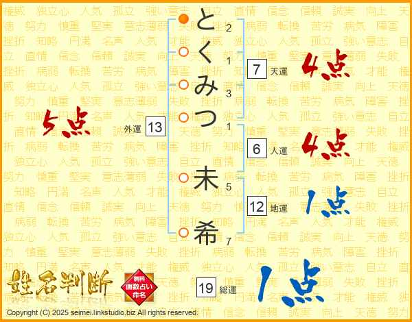 と(2画)く(1画)み(3画)つ(1画) 未(5画)希(7画)