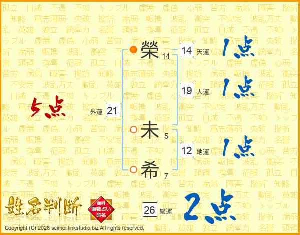 生活面を象徴する運勢です。外部から受ける影響力を表し、結婚運、家庭運や職場、環境への順応性を表します。総運から人運を引いた画数。姓や名が1文字の場合を除く。