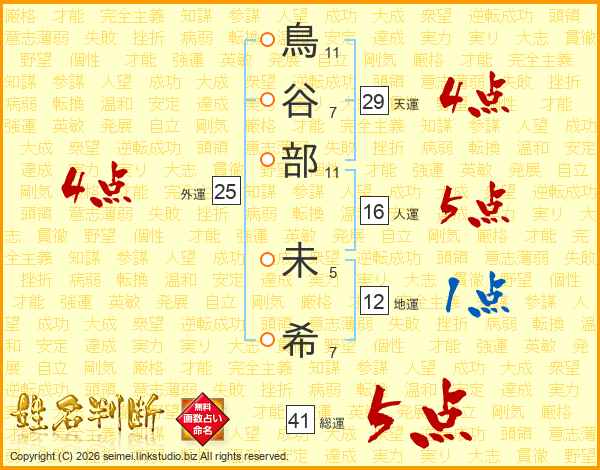 鳥(11画)谷(7画)部(11画) 未(5画)希(7画)