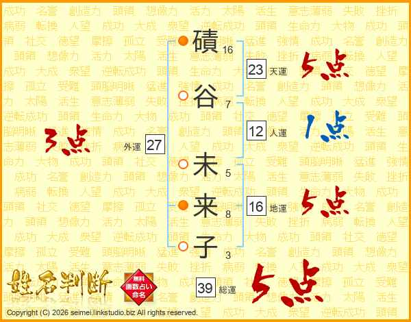 磧谷未来子さんの総運は39画の5点!
