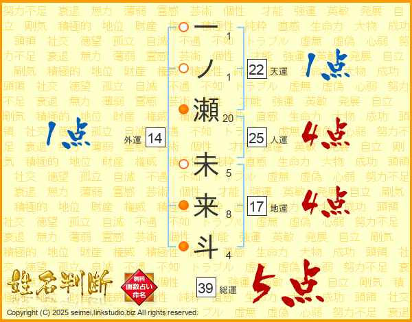 一ノ瀬未来斗さんの総運は39画の5点!