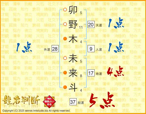 卯(5画)野(11画)木(4画) 未(5画)来(8画)斗(4画)