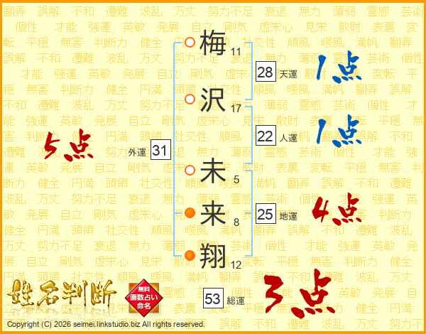 梅(11画)沢(17画) 未(5画)来(8画)翔(12画)