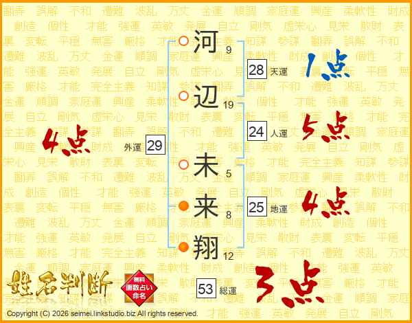 河(9画)辺(19画) 未(5画)来(8画)翔(12画)