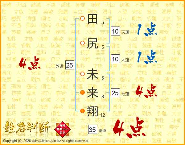 田(5画)尻(5画) 未(5画)来(8画)翔(12画)