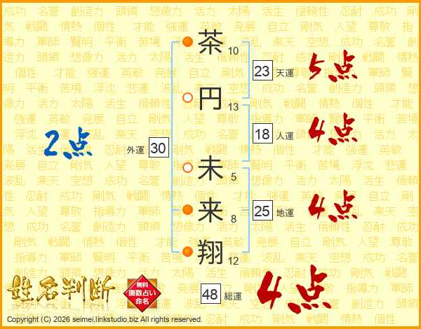 茶(10画)円(13画) 未(5画)来(8画)翔(12画)