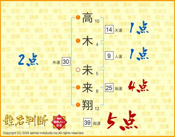 高木未来翔さんの総運は39画の5点!