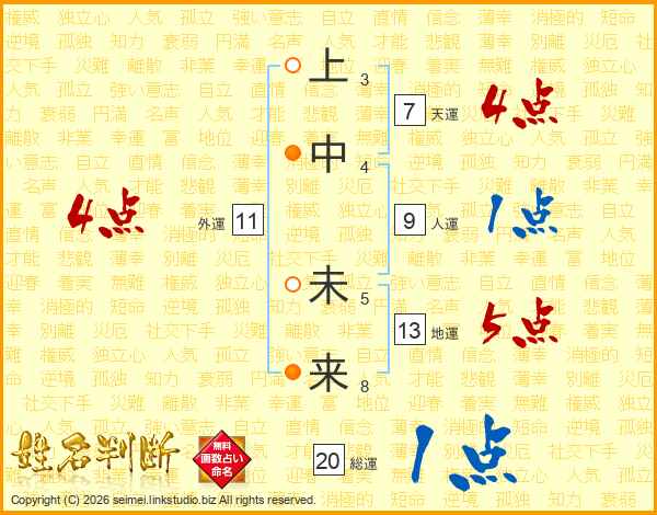 生活面を象徴する運勢です。外部から受ける影響力を表し、結婚運、家庭運や職場、環境への順応性を表します。総運から人運を引いた画数。姓や名が1文字の場合を除く。