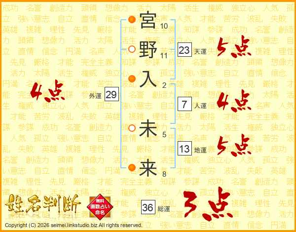 宮(10画)野(11画)入(2画) 未(5画)来(8画)