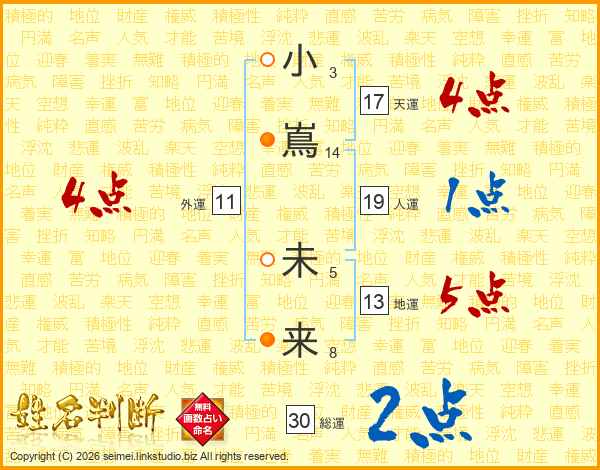 小(3画)嶌(14画) 未(5画)来(8画)