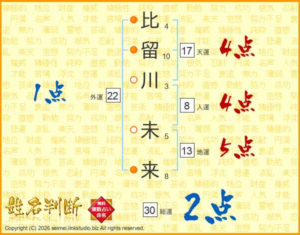 生活面を象徴する運勢です。外部から受ける影響力を表し、結婚運、家庭運や職場、環境への順応性を表します。総運から人運を引いた画数。姓や名が1文字の場合を除く。