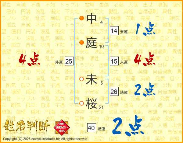 生活面を象徴する運勢です。外部から受ける影響力を表し、結婚運、家庭運や職場、環境への順応性を表します。総運から人運を引いた画数。姓や名が1文字の場合を除く。