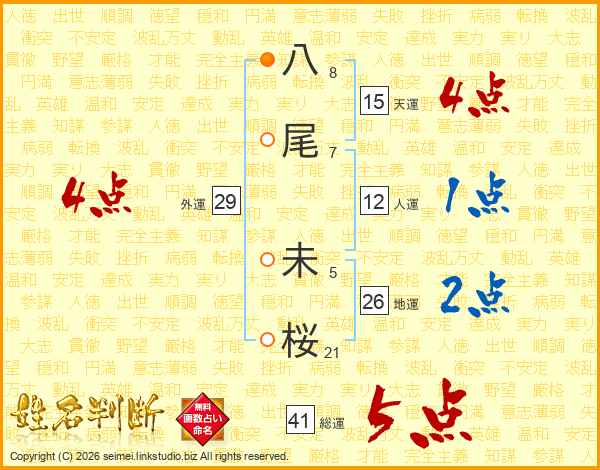 八尾未桜さんの総運は41画の5点!