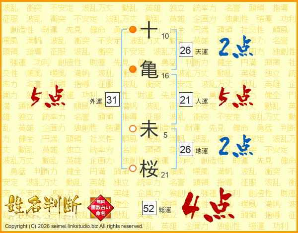 生活面を象徴する運勢です。外部から受ける影響力を表し、結婚運、家庭運や職場、環境への順応性を表します。総運から人運を引いた画数。姓や名が1文字の場合を除く。