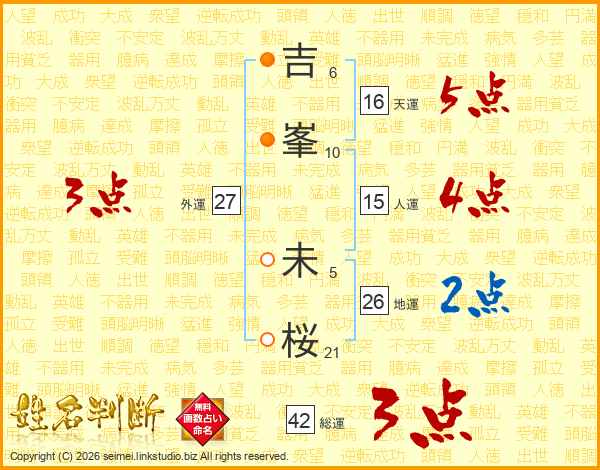 吉(6画)峯(10画) 未(5画)桜(21画)