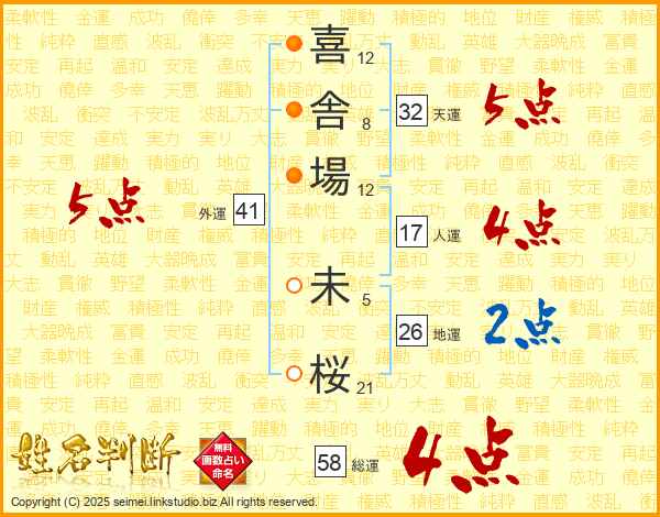 喜(12画)舎(8画)場(12画) 未(5画)桜(21画)