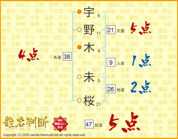 宇(6画)野(11画)木(4画) 未(5画)桜(21画)
