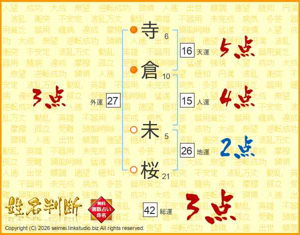 寺(6画)倉(10画) 未(5画)桜(21画)