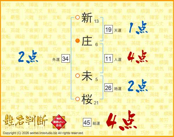 生活面を象徴する運勢です。外部から受ける影響力を表し、結婚運、家庭運や職場、環境への順応性を表します。総運から人運を引いた画数。姓や名が1文字の場合を除く。