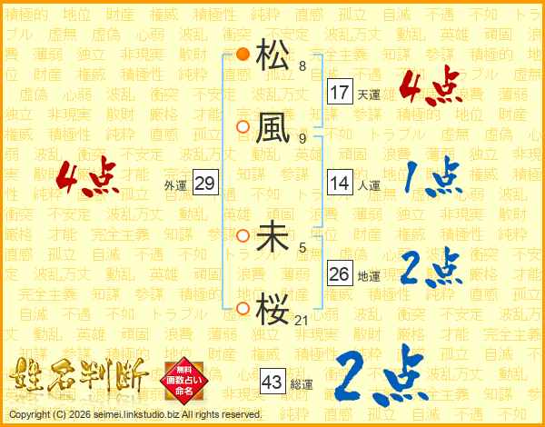 生活面を象徴する運勢です。外部から受ける影響力を表し、結婚運、家庭運や職場、環境への順応性を表します。総運から人運を引いた画数。姓や名が1文字の場合を除く。