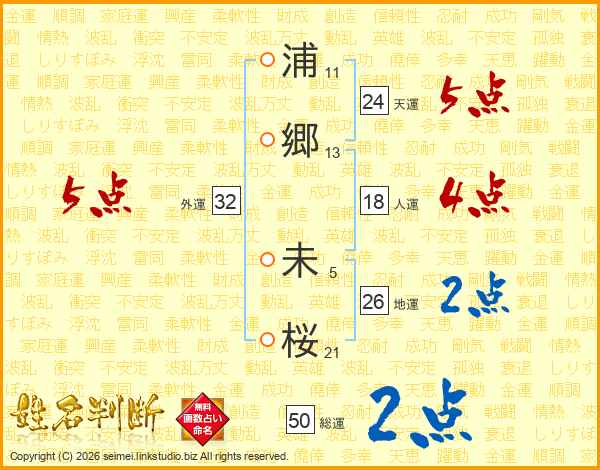 浦(11画)郷(13画) 未(5画)桜(21画)