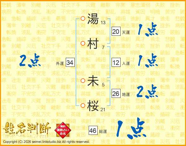 湯(13画)村(7画) 未(5画)桜(21画)