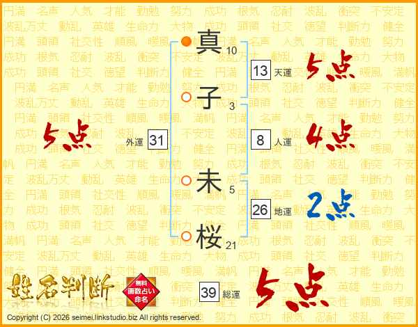 真子未桜さんの総運は39画の5点!