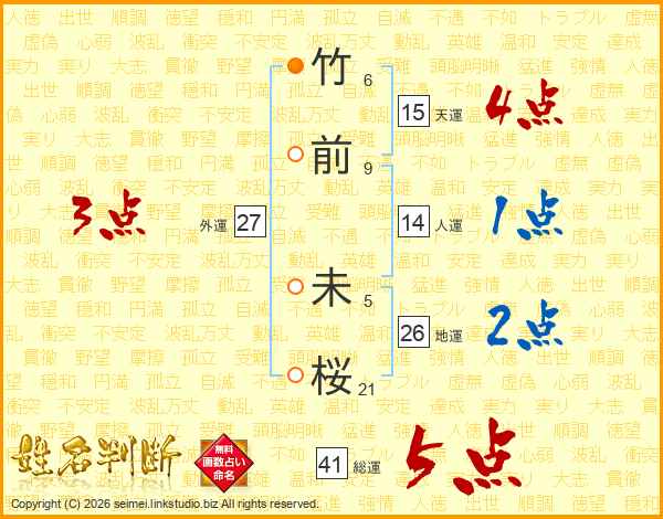竹前未桜さんの総運は41画の5点!