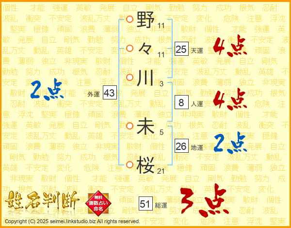 生活面を象徴する運勢です。外部から受ける影響力を表し、結婚運、家庭運や職場、環境への順応性を表します。総運から人運を引いた画数。姓や名が1文字の場合を除く。
