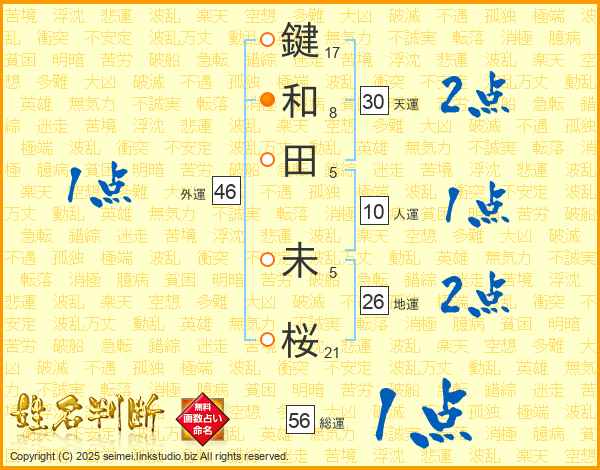 生活面を象徴する運勢です。外部から受ける影響力を表し、結婚運、家庭運や職場、環境への順応性を表します。総運から人運を引いた画数。姓や名が1文字の場合を除く。