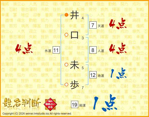 生活面を象徴する運勢です。外部から受ける影響力を表し、結婚運、家庭運や職場、環境への順応性を表します。総運から人運を引いた画数。姓や名が1文字の場合を除く。