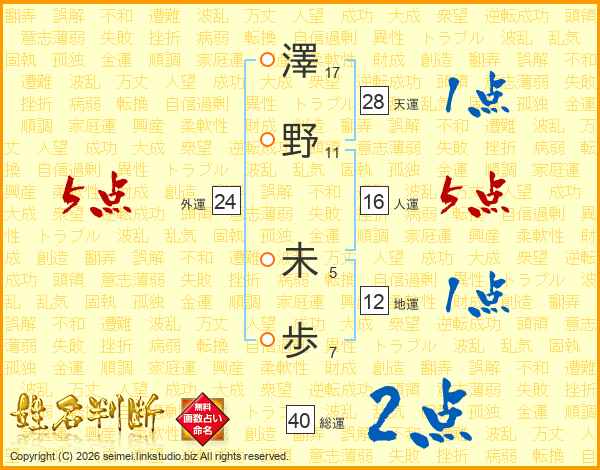 生活面を象徴する運勢です。外部から受ける影響力を表し、結婚運、家庭運や職場、環境への順応性を表します。総運から人運を引いた画数。姓や名が1文字の場合を除く。