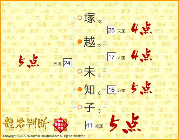 塚(13画)越(12画) 未(5画)知(8画)子(3画)