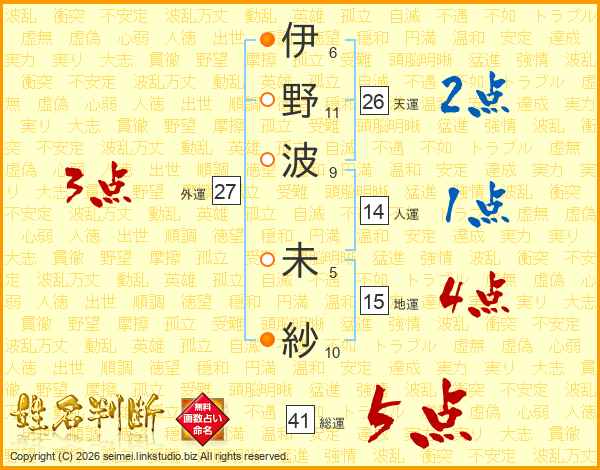 伊(6画)野(11画)波(9画) 未(5画)紗(10画)