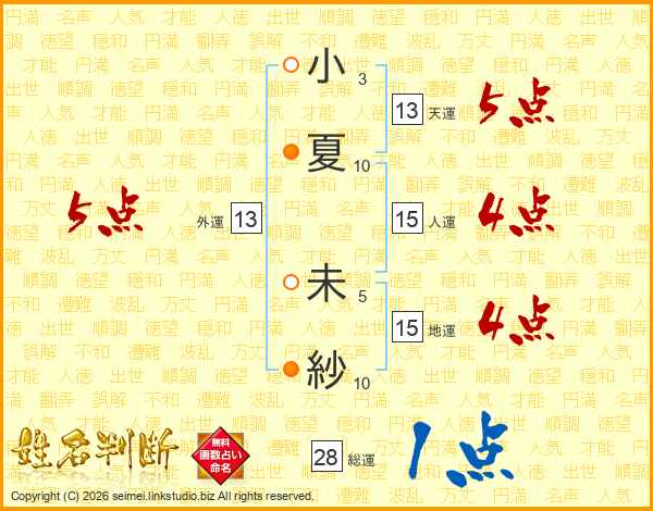 生活面を象徴する運勢です。外部から受ける影響力を表し、結婚運、家庭運や職場、環境への順応性を表します。総運から人運を引いた画数。姓や名が1文字の場合を除く。